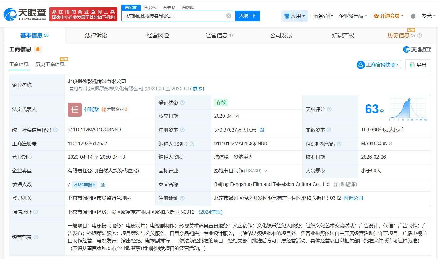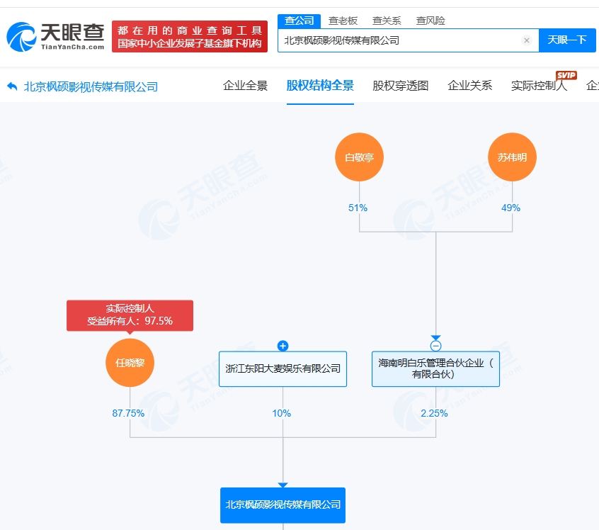北京枫硕影视传媒有限公司成立于2020年4月,法定代表人为任晓黎,经营范围含电影摄制服务、电影制片、电视剧制作等。股权全景穿透图显示,该公司现由任晓黎、海南明白乐管理合伙企业(有限合伙)及上述新增股东共同持股,其中海南明白乐管理合伙企业(有限合伙)由白敬亭、苏伟明共同出资。