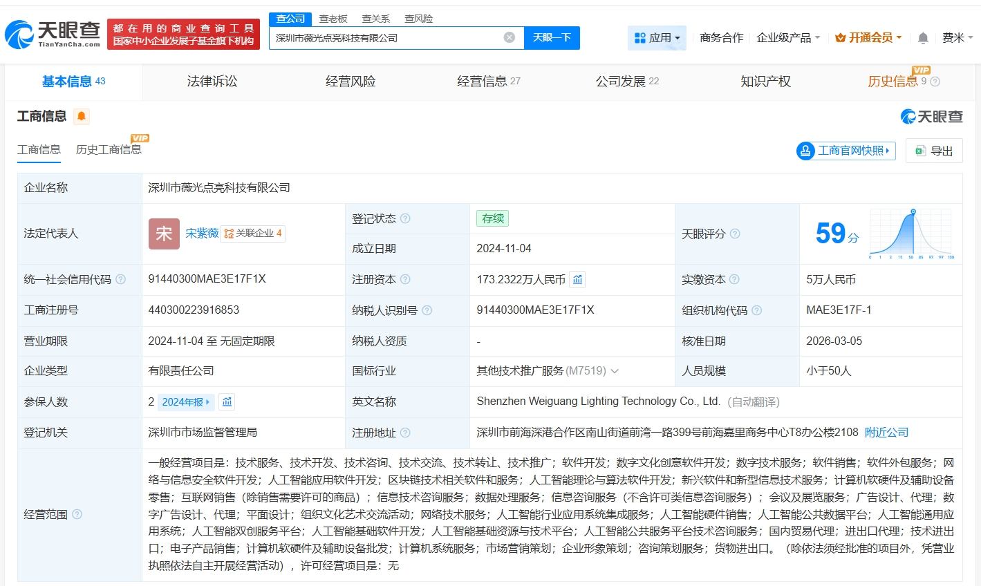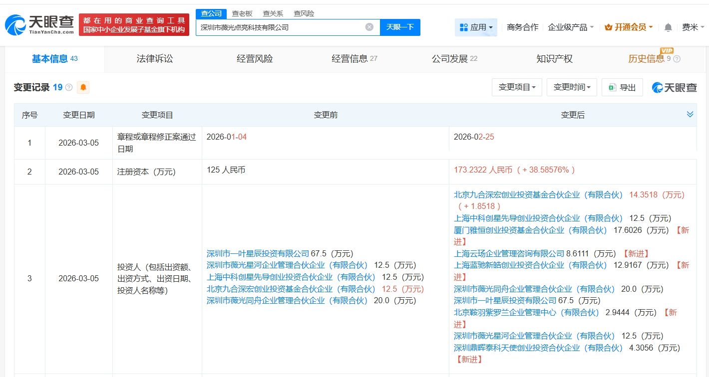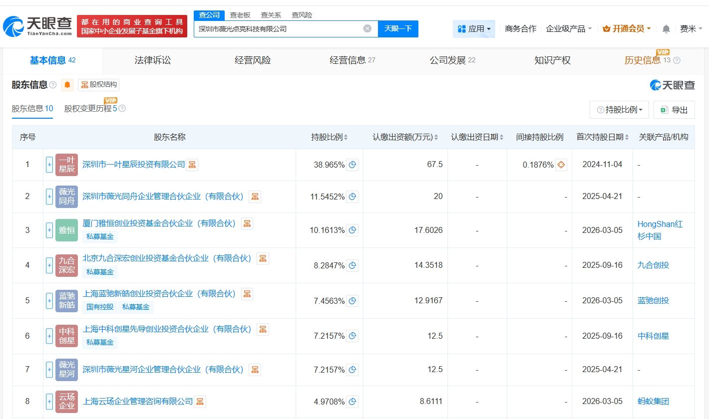 深圳市薇光点亮科技有限公司成立于2024年11月,法定代表人为宋紫薇,经营范围包括人工智能应用软件开发、人工智能理论与算法软件开发、数字技术服务等。股东信息显示,该公司现由深圳市一叶星辰投资有限公司、深圳市薇光同舟企业管理合伙企业(有限合伙)及上述新增股东等共同持股。公开资料显示,该公司是一家以AI Agent为核心的智能硬件创新企业。