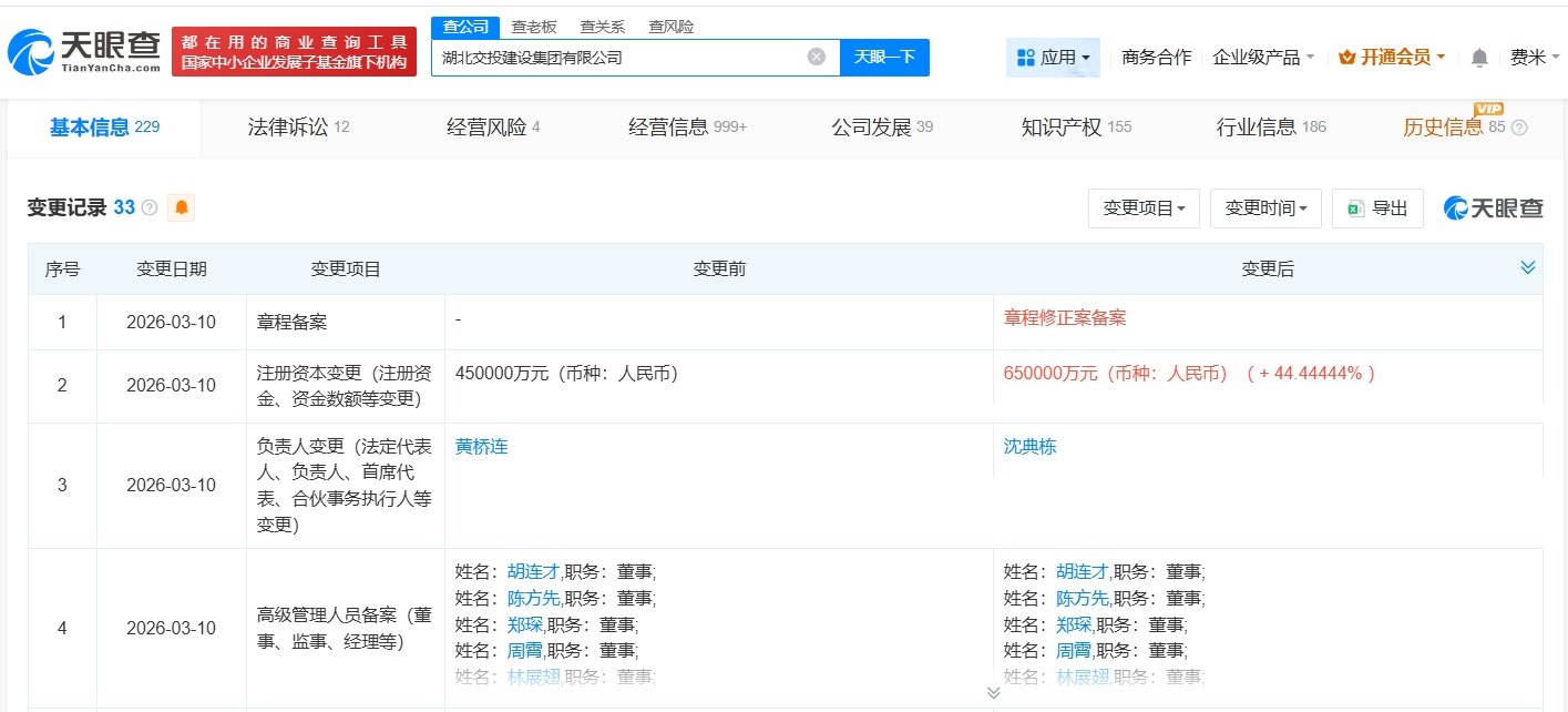 天眼查App显示,近日,湖北交投建设集团有限公司发生工商变更,黄桥连卸任法定代表人、董事长,由沈典栋接任,同时,注册资本由45亿人民币增至65亿人民币,增幅约44%。