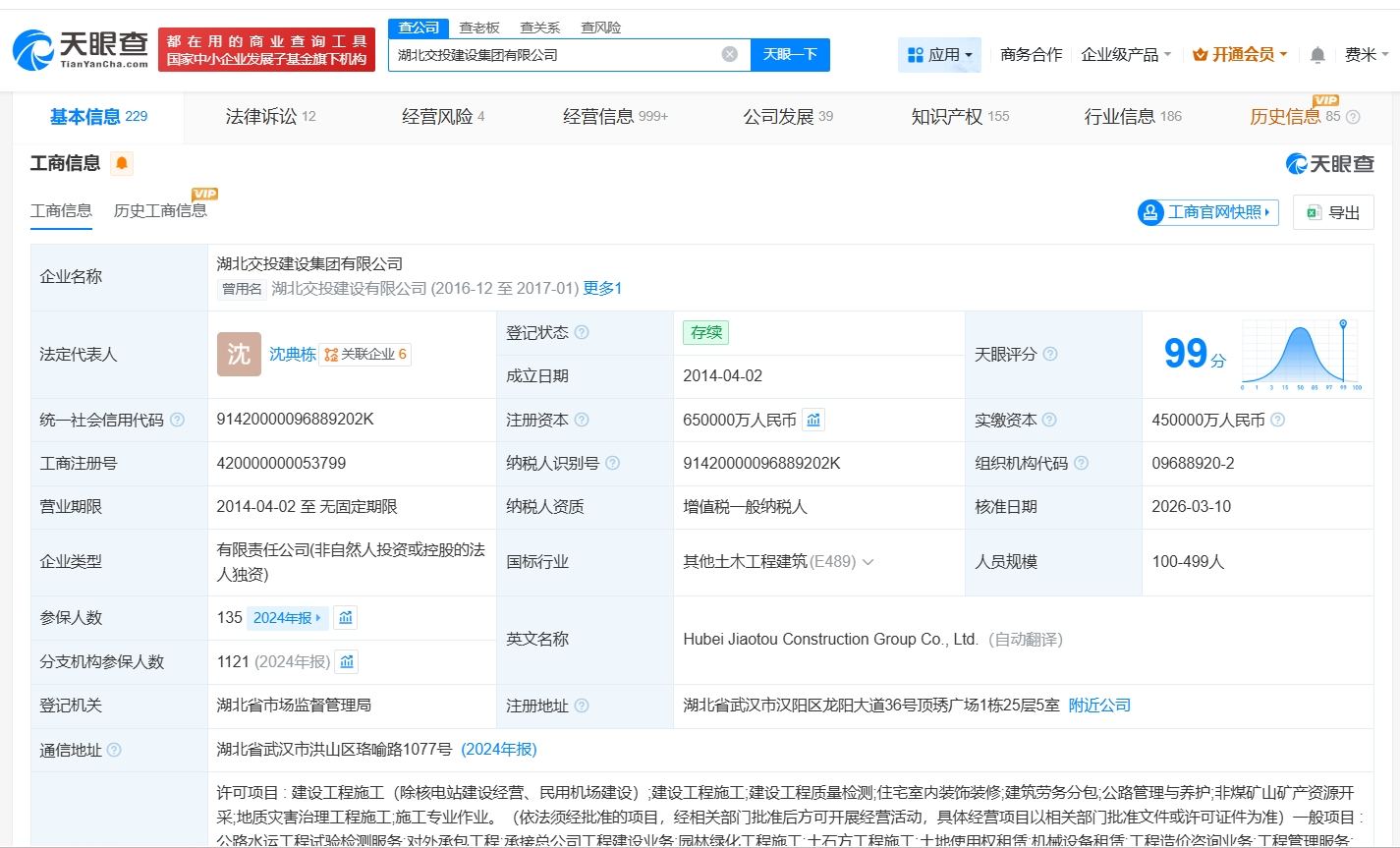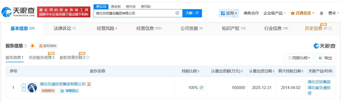 湖北交投建设集团有限公司成立于2014年4月,经营范围包括建设工程施工、公路水运工程试验检测服务、园林绿化工程施工等。股东信息显示,该公司由湖北交通投资集团有限公司全资持股。