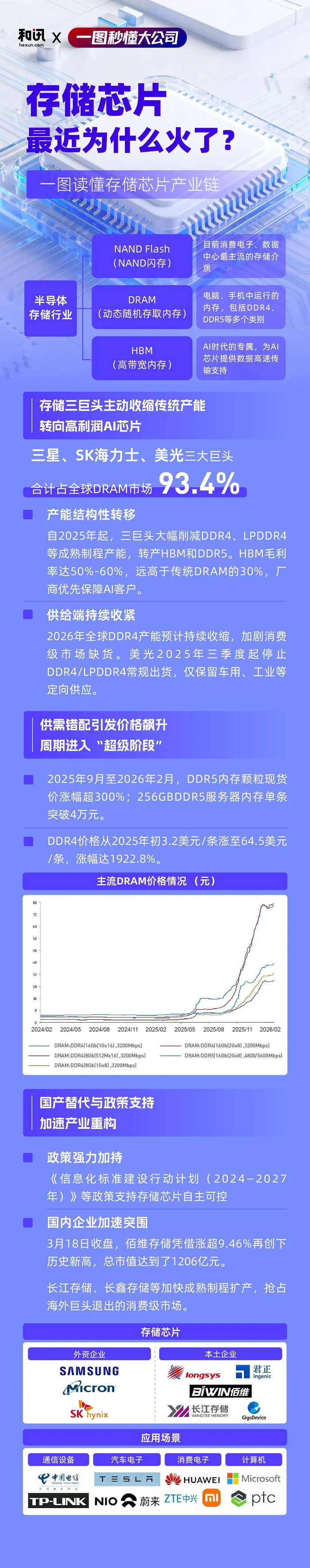 这一波爆发的根源,仍然是全球存储市场的产能转移。在存储产业中,有NAND Flash(NAND闪存)、DRAM(动态随机存取内存)和HBM(高带宽内存)几大核心品类。DRAM内存主要供向了电脑、手机中运行的内存,包括DDR4、DDR5等多个类别。HBM(高带宽内存)芯片更昂贵,且更适配AI数据中心。