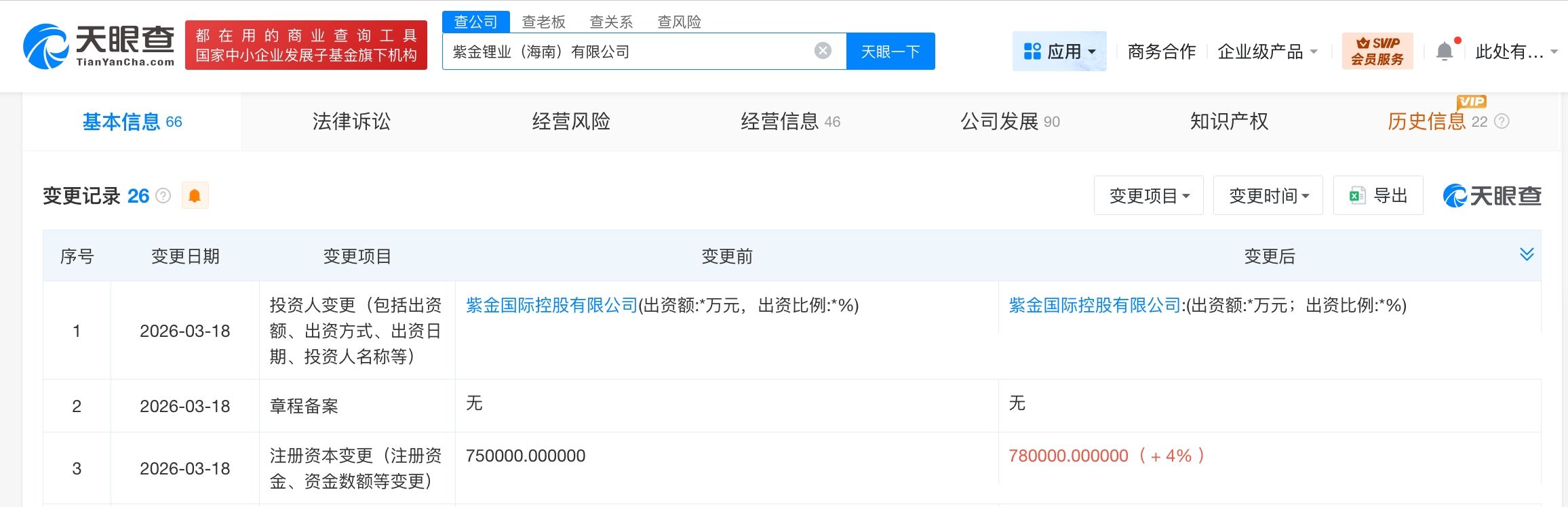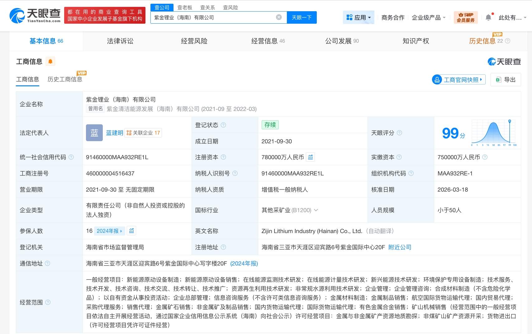 天眼查App显示,近日,紫金锂业(海南)有限公司发生工商变更,注册资本由75亿人民币增至78亿人民币。