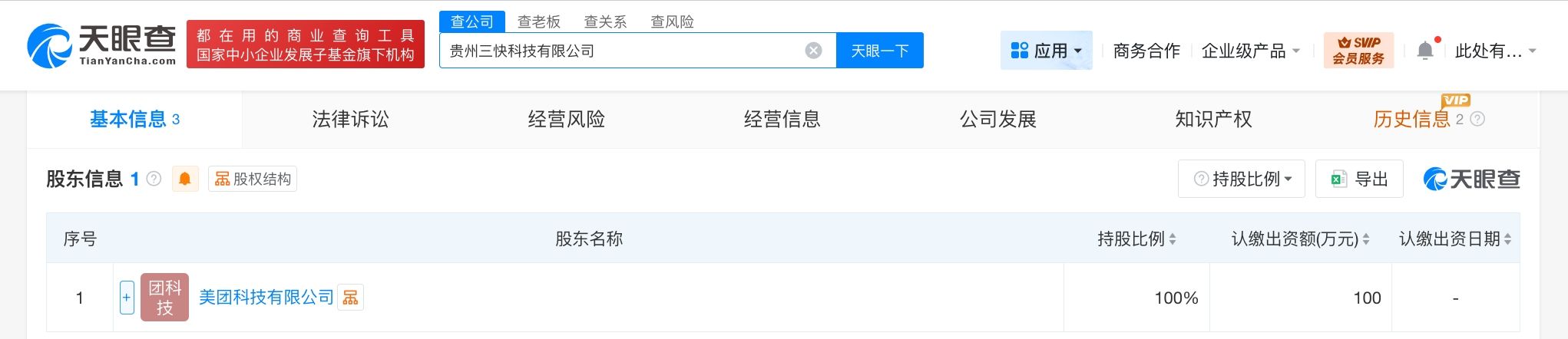 天眼查工商信息显示,近日,贵州三快科技有限公司成立,法定代表人为张旭准,注册资本100万人民币,经营范围为信息系统集成服务,软件开发,技术服务、技术开发、技术咨询、技术交流、技术转让、技术推广,软件销售。股东信息显示,该公司由美团科技有限公司全资持股。
