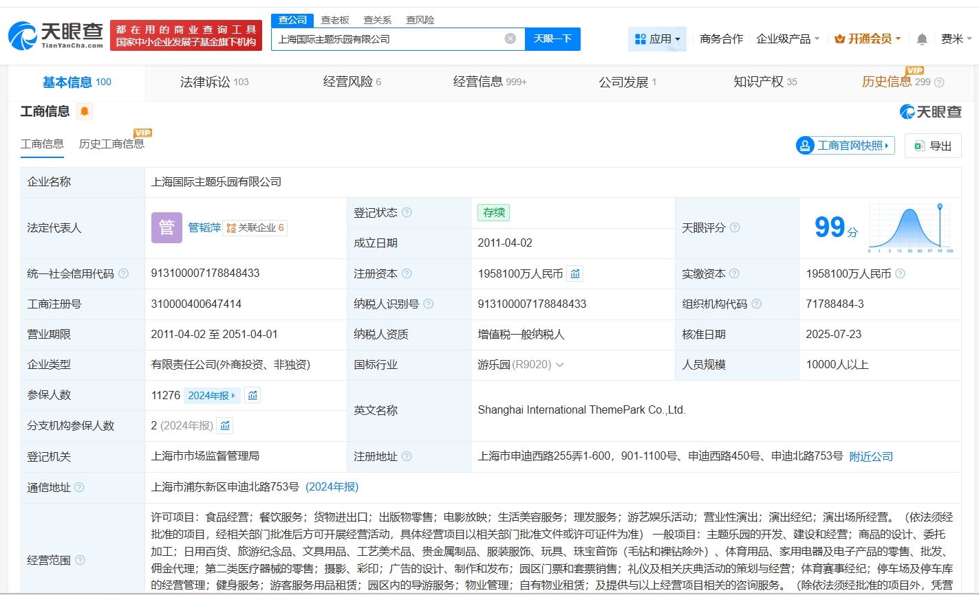 天眼查App显示,上海迪士尼度假区关联公司上海国际主题乐园有限公司成立于2011年4月,法定代表人为管韬萍,注册资本约195.8亿人民币,经营范围包括主题乐园的开发、建设和经营,食品经营,餐饮服务等,由上海申迪旅游度假开发有限公司、WD HOLDINGS(SHANGHAI),LLC共同持股。法律诉讼信息显示,该公司曾因服务合同纠纷、娱乐服务合同纠纷、合同纠纷等被起诉。