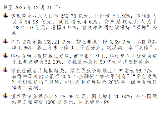 截至报告期末,渤海银行资产总额达到19344.10亿元,较上年末增长4.91%;负债总额18091.83亿元,较上年末增长4.35%。报告期内,该行持续加大服务实体经济力度,积极拓展基础客户,不断优化业务结构,主要盈利指标稳步增长。2025年全年实现营业收入259.70亿元,较上年增长4.88亿元,增幅1.92%;实现净利润54.98亿元,较上年增长2.42亿元,增幅4.61%,营收与净利润持续稳健提升。同时,该行持续深化降本增效举措,成本收入比较上年降低1.00个百分点至38.01%,精细化管理成效显著。