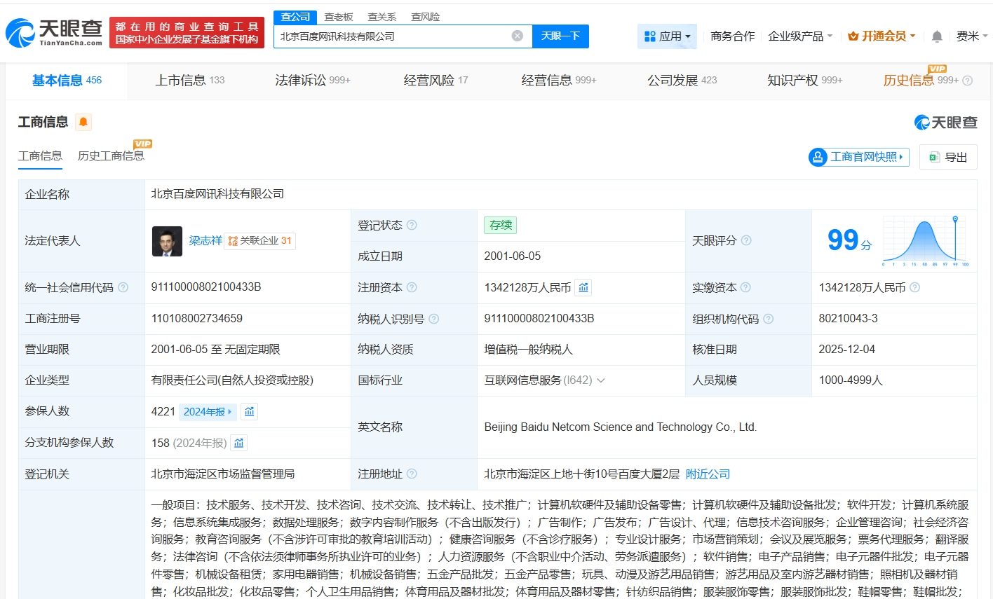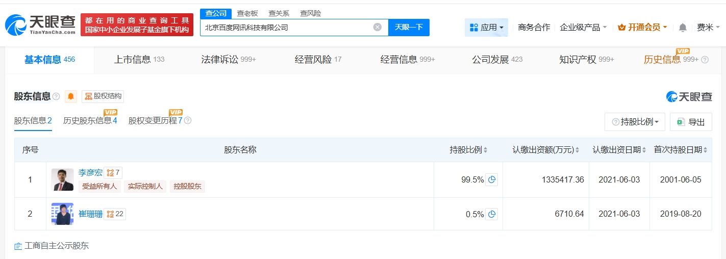 北京百度网讯科技有限公司成立于2001年6月,法定代表人为梁志祥,注册资本约134.2亿人民币,经营范围包括计算机软硬件及辅助设备零售、计算机软硬件及辅助设备批发、软件开发等,由李彦宏、崔珊珊共同持股。