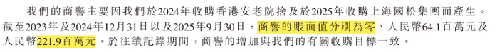更令人担忧的是商誉的急剧膨胀。 截至2025年9月30日,公司商誉从2023年底的几乎为零激增至2.22亿元,全部来自并购——斥资近3亿元收购上海国松集团,又斥资逾1亿港元收购香港安老院舍。并购可以快速堆高营收,但整合风险、文化冲突、管理层精力分散,都是潜在的“隐形地雷”。有鉴于锦欣生殖商誉暴雷对其业绩的重挫,锦欣康养同样存在巨额商誉悬顶风险。