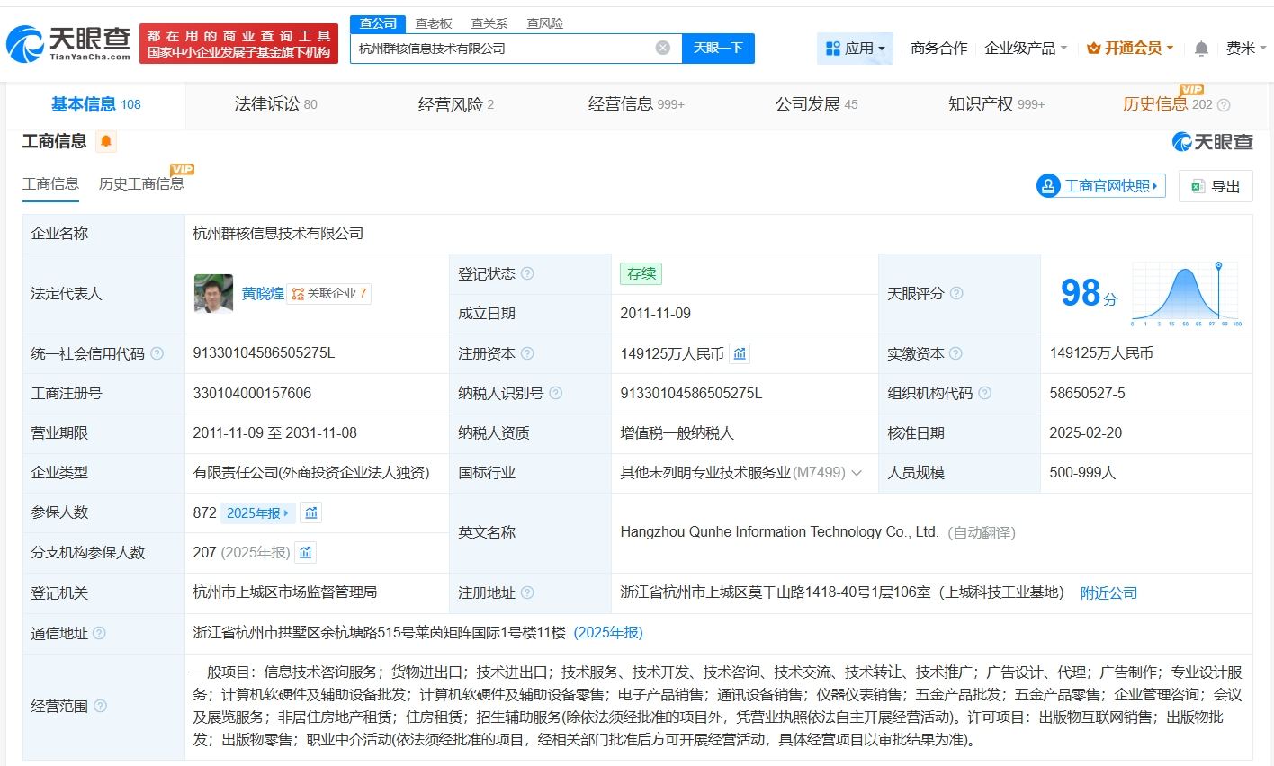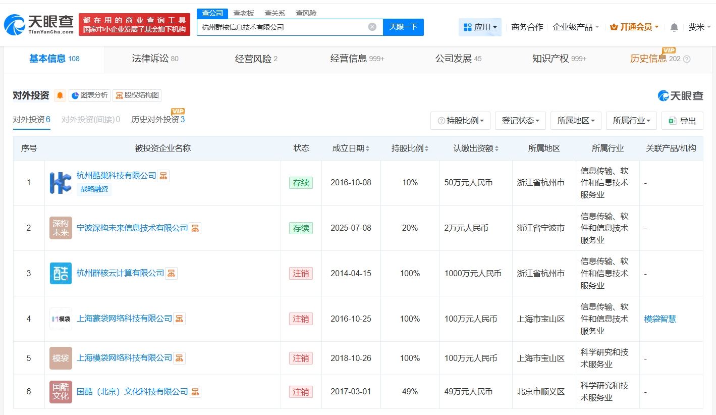 天眼查App显示,群核科技关联公司杭州群核信息技术有限公司成立于2011年11月,法定代表人为黄晓煌,经营范围包括信息技术咨询服务、货物进出口、技术进出口等,由杭州云家装网络科技有限公司全资持股。对外投资信息显示,该公司对外投资6家企业。变更记录显示,去年2月,该公司注册资本由约14.6亿人民币增至约14.9亿人民币。