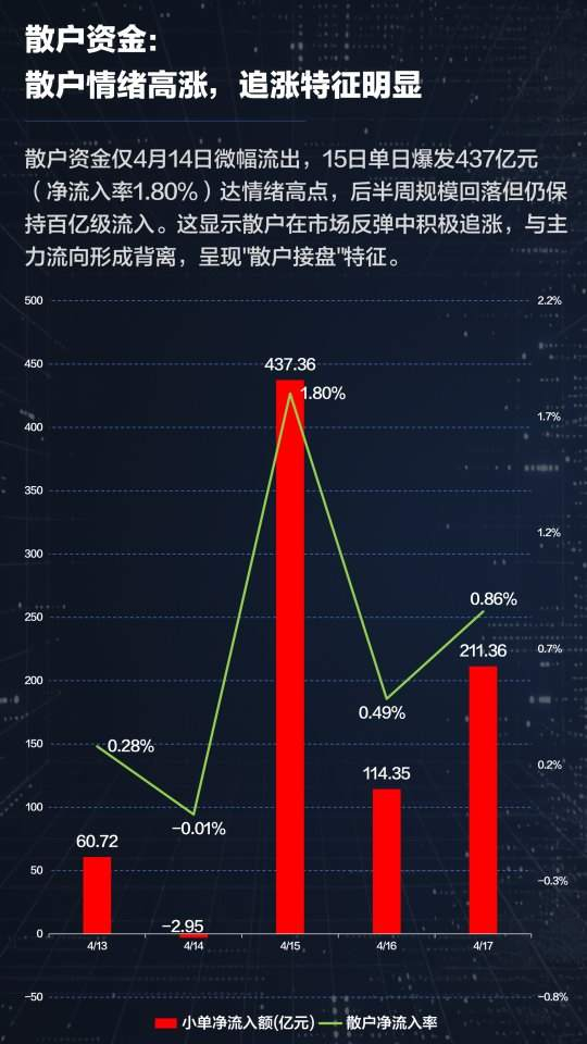 散户资金本周仅4月14日微幅流出,15日单日爆发437亿元净流入(净流入率1.80%)达情绪高点,后半周规模回落但仍保持百亿级流入。