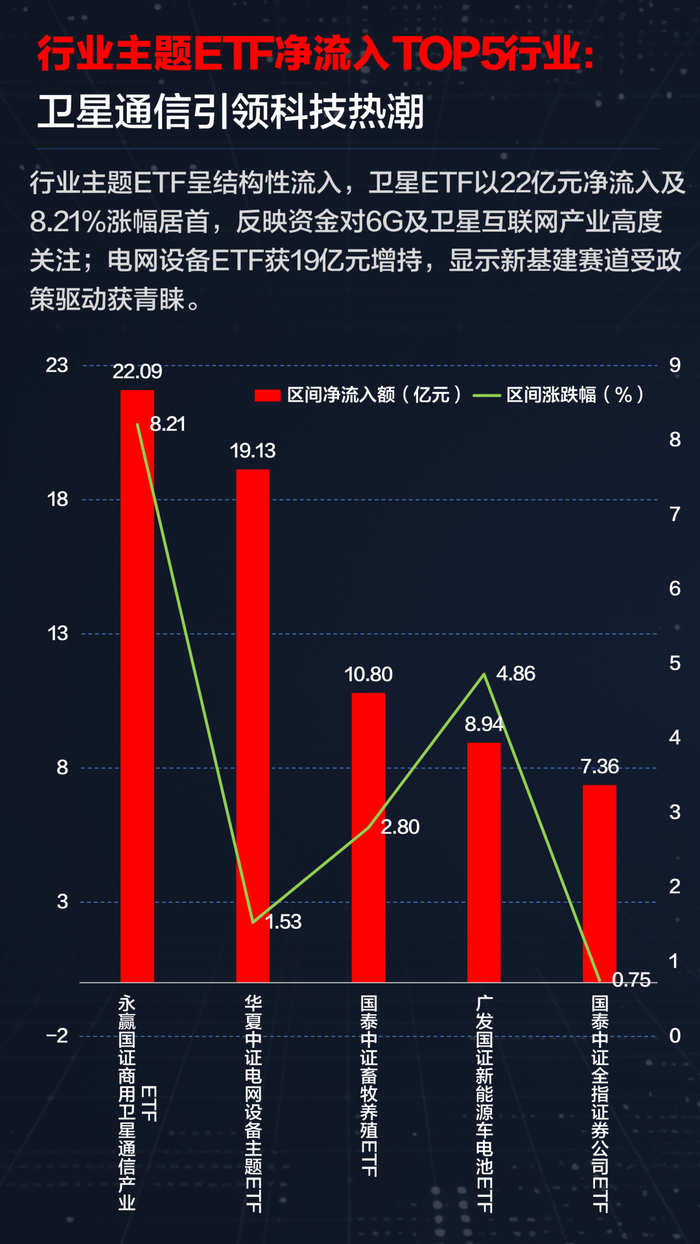 行业主题ETF方面,卫星ETF以22亿元净流入及8.21%涨幅居首,电网设备ETF获19亿元增持;而半导体、芯片及人工智能赛道占据净流出TOP5中的四席,且周涨幅均超4%,同样呈现“越涨越赎”特征。