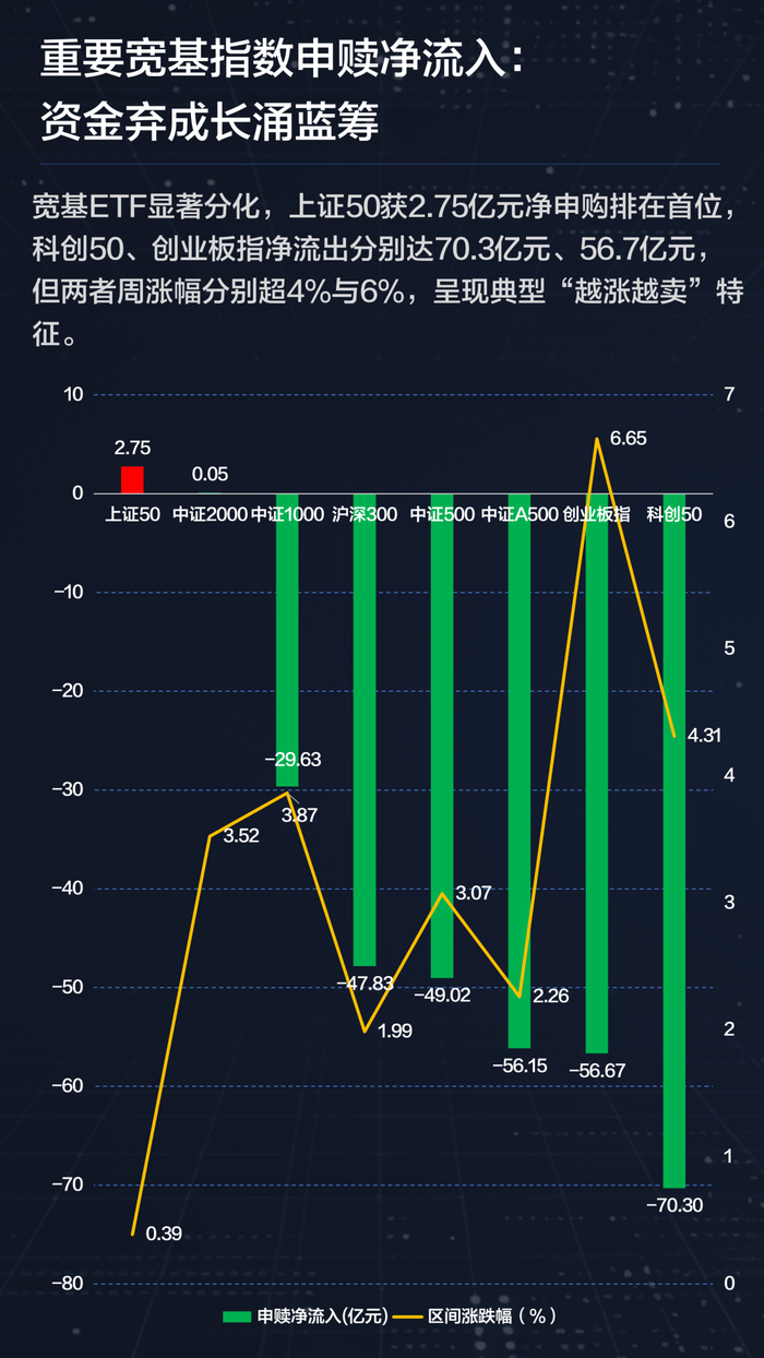 宽基指数ETF内部显著分化:上证50获2.75亿元净申购排在首位,科创50、创业板指净流出分别达70.3亿元、56.7亿元,但两者周涨幅分别超4%与6%,呈现典型“越涨越卖”特征。