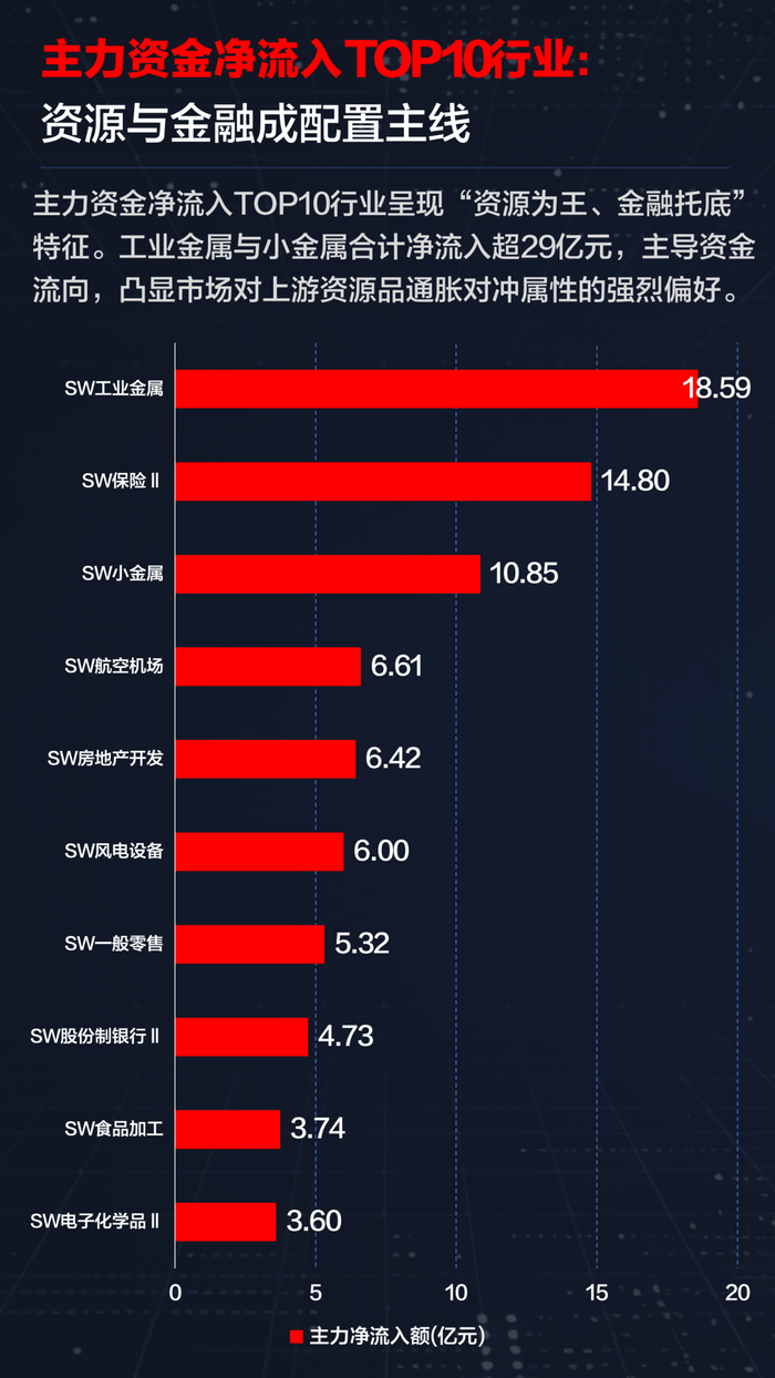 行业配置方面,按申万一级行业统计,主力资金流入居于首位的是有色金属,主力净流入额超16亿元,凸显市场对上游资源品通胀对冲属性的偏好。