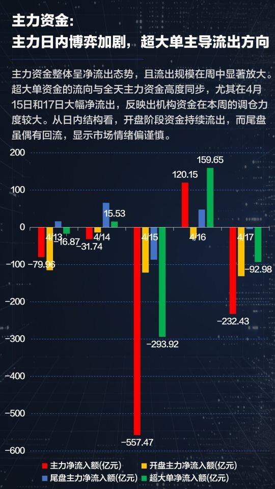 主力资金整体呈净流出态势,且流出规模在周中显著放大。超大单资金流向与全天主力资金高度同步,4月15日和17日出现大幅净流出,反映出机构资金调仓意愿强烈。从日内结构看,开盘阶段资金持续流出,尾盘虽有偶发性回流,但难以扭转整体谨慎态势。
