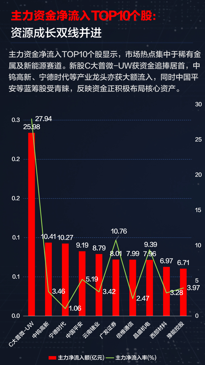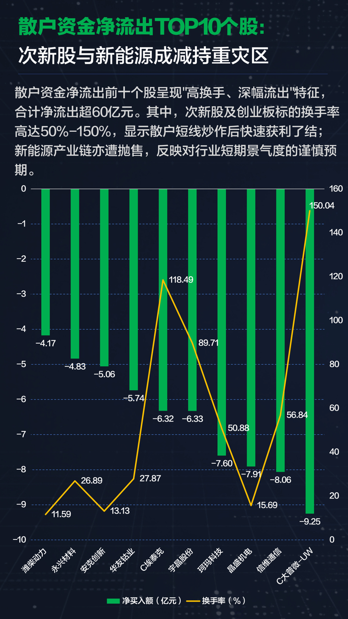 散户资金净流出方面,次新股与新能源成减持重灾区,净流出前十个股合计流出超60亿元,其中次新股及创业板标的换手率高达50%至150%,显示散户短线炒作后快速获利了结;新能源产业链亦遭抛售,反映对行业短期景气度的谨慎预期。