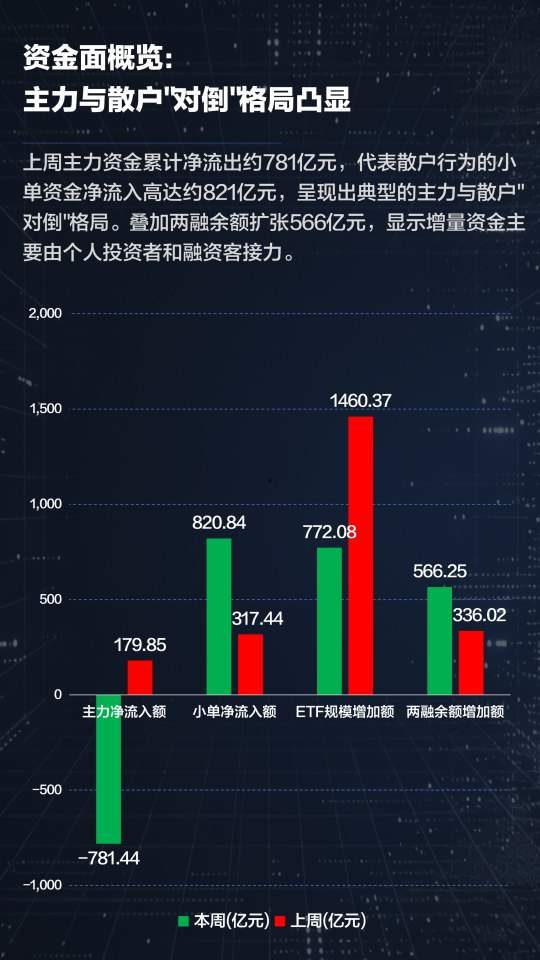 主力资金累计净流出约781亿元,与此形成鲜明对比的是,代表散户行为的小单资金净流入高达约821亿元,呈现出典型的主力与散户"对倒"格局。叠加两融余额扩张566亿元,显示增量资金主要由个人投资者和融资客接力。