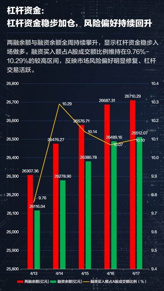 杠杆资金稳步入场做多,两融余额与融资余额全周持续攀升,市场风险偏好明显修复。