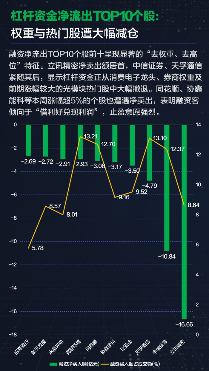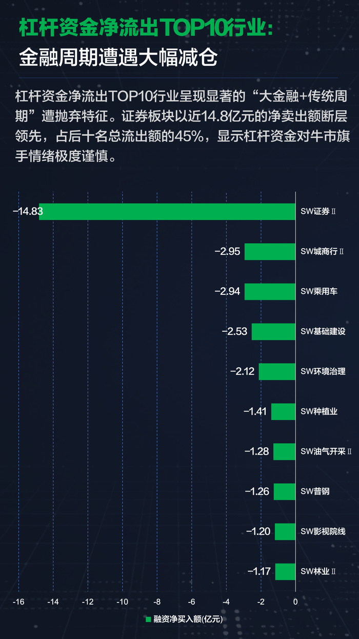 融资净流出TOP10行业则呈现“大金融+传统周期”遭抛弃特征,证券板块以近14.8亿元的净卖出额居首,反映杠杆资金对“牛市旗手”情绪谨慎。