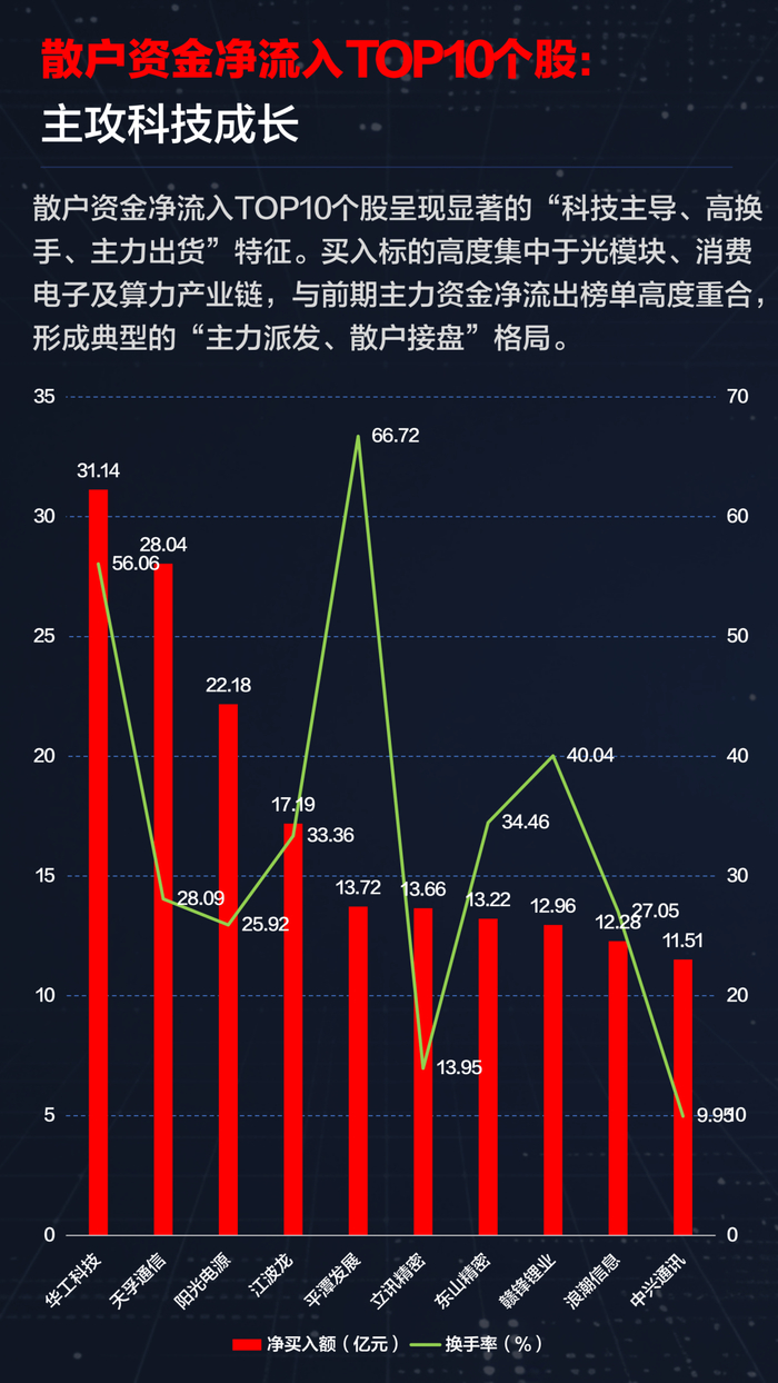 买入标的高度集中于光模块、消费电子及算力产业链,与前期主力资金净流出榜单高度重合,形成典型的“主力派发、散户接盘”格局。