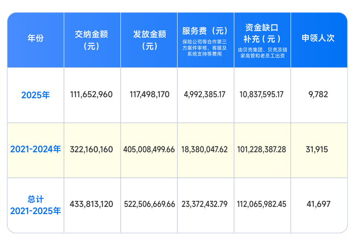 年度资金缺口1083.76万元则由公司高管全额补齐。2021至2025年间,累计由贝壳集团、贝壳及链家的高管与老员工出资补贴资金已超1.12亿元。