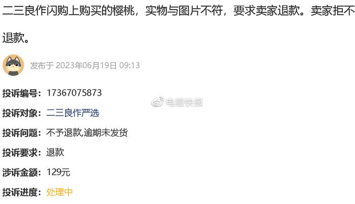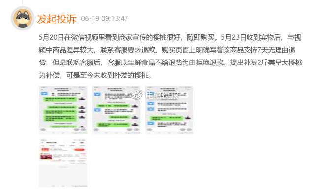 2023年6月19日,有消费者投诉称“5月20日在微信视频里看到商家宣传的樱桃很好,随即购买。5月23日收到实物后,与视频中商品差异较大,联系客服要求退款。购买页面上明确写着该商品支持7天无理由退货,但是联系客服后,客服以生鲜食品不给退货为由拒绝退款。提出补发2斤美早大樱桃为补偿,可是至今未收到补发的樱桃。”