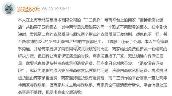 2023年6月20日,有消费者投诉称“本人在上海禾湉信息技术有限公司的“二三良作”电商平台上的商家“羽稀服饰女装店”共购买了四套睡衣,其中两套是先后购买的同一个款式不同型号的睡衣,在拿到快递时,发现第二套的衣服质量与原先同个款式的衣服质量天差地别,颜色也不一样,甚至新拿到的2XL的型号比原来L型号的衣服都还小,且衣服上还破了个洞,本人与商家联系沟通,并给商家提供了两套同样款式衣服的对比图,商家给出免费重新发一套给我的解决方案,但在我让商家保证质量的时候,商家说更换了厂家,无法明确向我保证质量,我要求直接退货并由商家承担退货运费,但商家只会对我重复:“退货没有运费险”,我认为退货的原因完全是商家货品质量的问题,应该由商家承担运费,再次提出退货且由商家承担运费,商家坚持退货没有运费险,而二三良作的平台客服一直让我等待商家与我联系,但商家并未主动与我联系。商家完全不顾消费者诉求,平台消极处理甚至是不处理。现要求商家全额退款!”