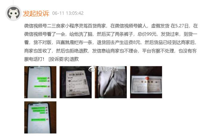 2023年6月11日,有消费者投诉称“微信视频号二三良家小程序灵笃百货商家,在微信视频号骗人,虚假发货 在5.27日,在微信视频号看了一会,给他洗了脑,然后买了两条裤子,总价99元,发货过来,到货一看,货不对版,简直就是烂布一条,退货回去产生运费8元,然后货品已经到达商家后,商家也签收了,然后也拒绝退款,发信息给商家也不理会,平台客服不处理,也没有客服电话打!”