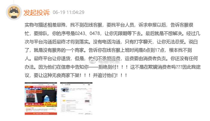 有消费者投诉称“实物与描述相差悬殊,找不到在线客服,要找平台人员,诉求申报以后,告诉客服很忙,要排队,你的序号是0243、0478,让你无限期等下去。最后就是不想解决。经过几次与平台沟通后最终才得到落实。没有电话沟通,只有打字聊天,让你无法忍受。说白了,就是没有服务的一个商家。告诉你在线客服上班时间是8点到17点,根本找不到人。最终平台让你退货,但是,他们不承担运费,运费要由消费者负责。你还没有任何办法。因为他们在信息中告知你——拒绝到付!!!这不是在欺骗消费者吗???因此我建议,要让这种无良商家下架!!!并追讨他们!!!”