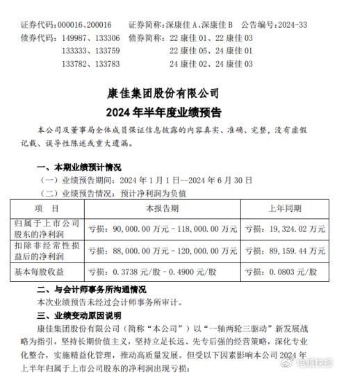 深康佳A 2024 年半年度业绩预告