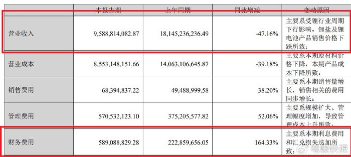 赣锋锂业在半年报中指出,营业收入下降主要系受锂行业周期下行影响,锂盐及锂电池产品销售价格下跌所致。其次,财报数据显示,公司的财务费用高达5.89亿人民币,相比去年暴增了1.6倍。