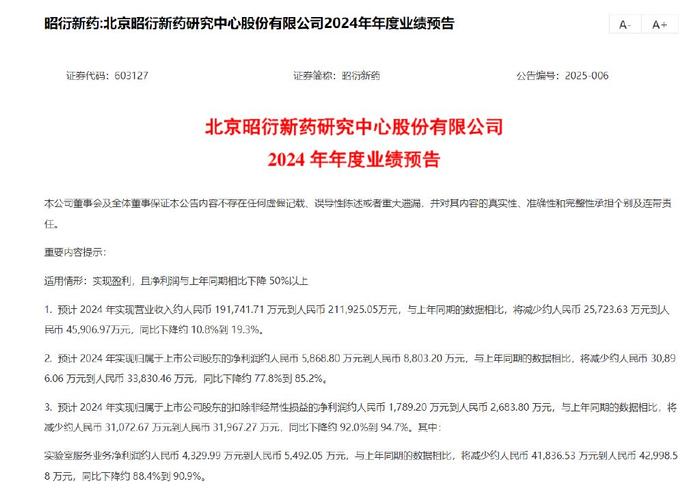 昭衍新药发布的2024年业绩预告显示,预计2024年实现营业收入19.17亿元至21.19亿元,同比下降10.8%-19.3%;归母净利润5868.8万元至8803.2万元,同比下降77.8%-85.2%;扣非净利润预计1789.2万元2683.8万元,同比下降92%-94.7%。