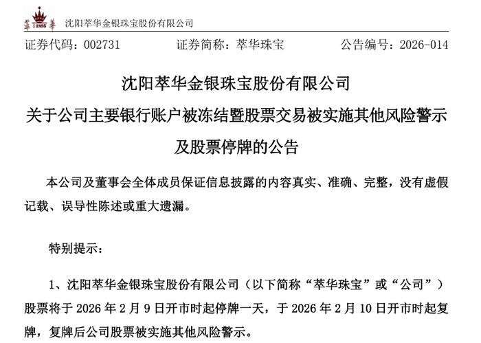 公告显示,因萃华珠宝资金紧张,流动性短缺,公司及子公司多笔金融机构贷款逾期违约,截至 2026 年 2 月 6 日,公司及部分子公司累计借款逾期本金为25,400 万元。多家金融机构已提起诉讼或仲裁,从而导致公司及子公司主要银行账户被人民法院冻结,对公司业务开展带来重大影响。经慎重判断,公司基于谨慎原则认为,属于主要银行账户被冻结的情形,触及深圳证券交易所《股票上市规则(2025 年修订)》第9.8.1 条第(六)项的规定,公司股票交易将被实施其他风险警示。