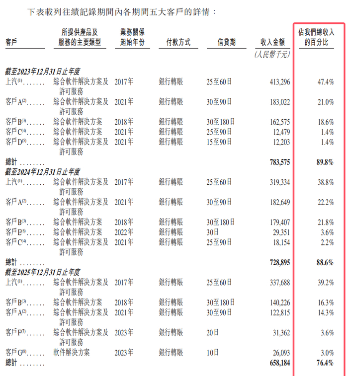 报告期内,斑马智能向前五大客户销售的收入分别为7.83亿元、7.29亿元、6.58亿元,占公司总收入的比重为89.9%、88.6%、76.4%。同期,该公司向第一大客户销售的收入分别为4.13亿元、3.19亿元、3.38亿元,占公司总收入的比重为47.4%、38.8%、39.2%。
