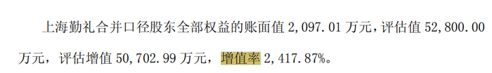 公告显示,此次溢价率高达24倍。即上海勤礼净资产账面价值为2097.46万元,而评估值则达到5.28亿元,增值率高达2417.87%。