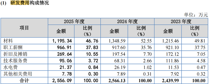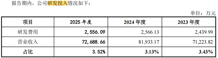 招股书显示,报告期内,永大股份的研发费用分别为2,439.99万元、2,566.13万元和2556.09万元,占营业收入的比例分别为3.43%、3.13%和3.52%。2023年度与2024年度,该公司研发费用分别同比增长211.66万元、126.14万元,增幅分别为9.50%、5.17%。