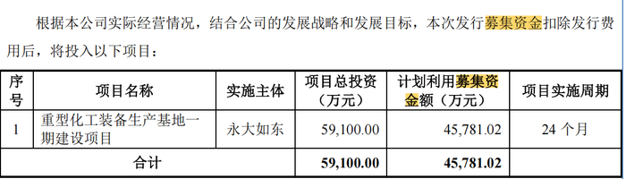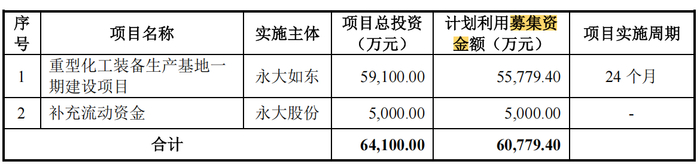 招股书显示,此次IPO,永大股份计划募集资金4.58亿元,全部用于重型化工装备生产基地一期建设项目。