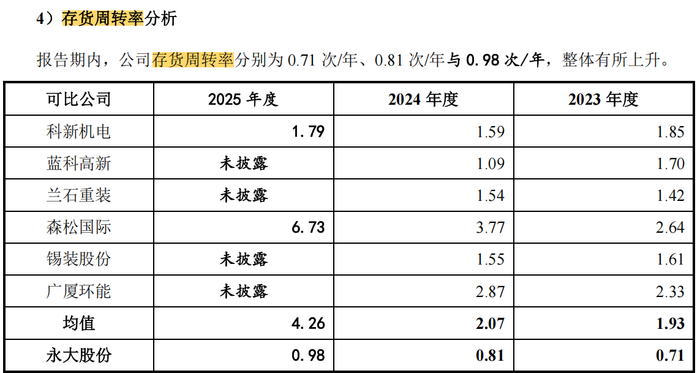 报告期内,永大股份的存货周转率分别为0.71次/年、0.81次/年和0.98次/年,同期同行可比公司的均值分别为1.93次/年、2.16次/年和4.26次/年。可见,永大股份的存货周转率明显低于可比公司均值。