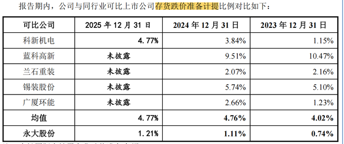 然而,值得注意的是,报告期内,永大股份的存货跌价准备计提比例分别为0.74%、1.11%和1.21%,同期可比公司的均值分别为4.02%、4.76%和4.77%。