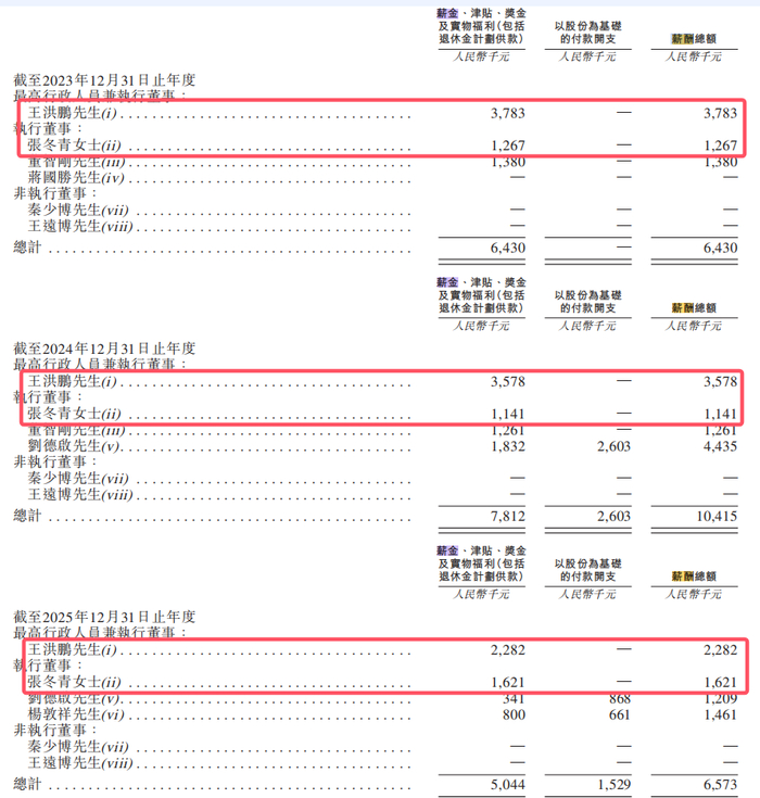 据招股书披露,2023年至2025年,王洪鹏的年薪分别为378.3万元、357.8万元、228.2万元,三年总计964.3万元;其配偶张冬青的年薪分别为126.7万元、114.1万元、162.1万元,三年总计402.9万元。由此可见,过去三年间,实控人夫妇仅薪酬这一项的收入就高达1367.2万元。