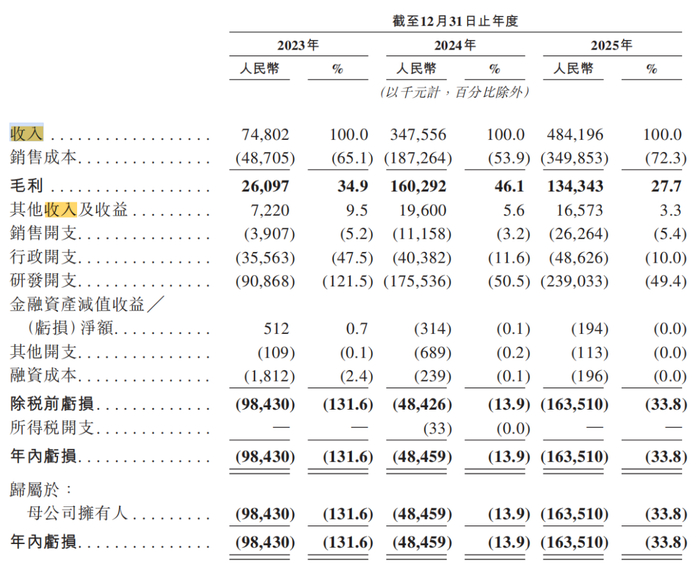 招股书显示,2023年至2025年,中茵微电子的收入分别为7480.2万元、3.48亿元、4.84亿元,2024年同比增速高达364.63%,但2025年增速骤降至39.31%;同期,该公司分别净亏损9843万元、4845.9万元、1.64亿元,2025年的亏损规模明显扩大。