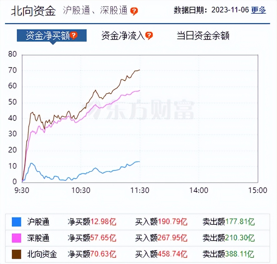 【北向资金净流入70亿元】截止午间收盘,北上资金净流入70.63亿。
