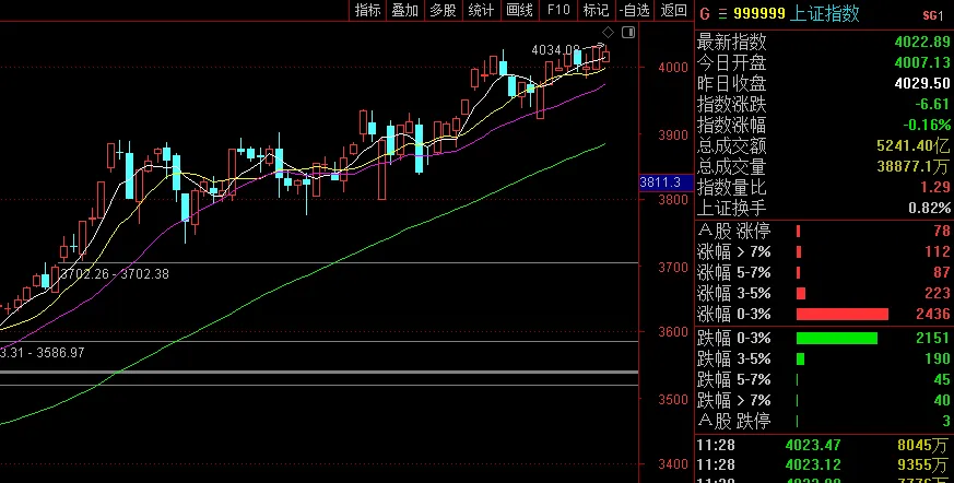 今上午大盘低开22点4007点即为最低点,冲高4034点,午前收4022点。上证50、沪深300、上证指数、深成指、创业板、科创板、中证500、中证1000跌0.28%、0.75%、0.16%、1.10%、1.74%、1.50%、0.80%、0.30%。个股涨跌比为2858:2426,涨跌停比76:2。两市半日成交额为1.23万亿,较上个交易日缩量257亿。
