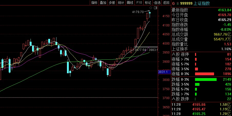 今上午大盘高开4点4169点,探底4141点,冲高4179点,午前收4163点。上证50、沪深300涨0.21%、0.01%,上证指数、深成指、创业板、科创板、中证500、中证1000跌0.03%、0.31%、0.83%、1.77%、0.27%、0.71%。个股涨跌比为2430:2865,涨跌停比114:26。两市半日成交额为2.44万亿,较上个交易日放量1283亿。