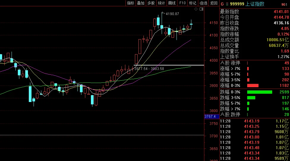上午大盘从4160点回落到4124点,午前收4141点,符合我在4130点上方反复震荡整固、洗盘换手的预期。我想这种指数和个股轮番调整的横向震荡整理格局,将延续到月末,甚至很可能延续到春节前。