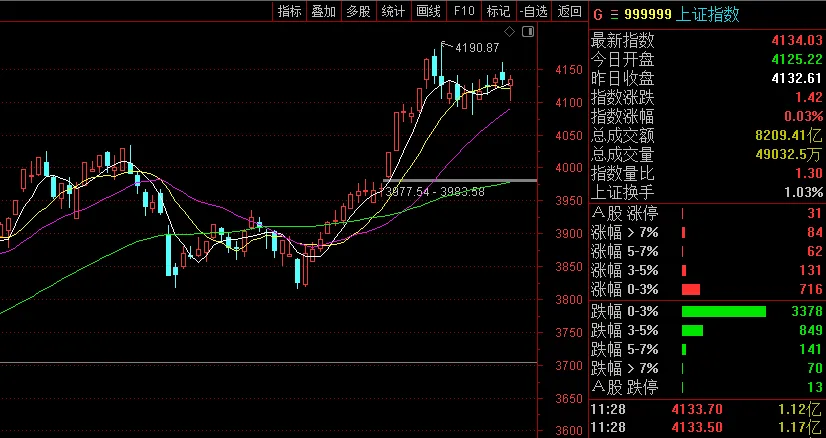 今上午大盘低开7点4125点,探底4101点,冲高4142点,午前收4134点。上证50、沪深300、上证指数、创业板、科创板涨0.75%、0.30%、0.03%、0.44%、0.57%,深成指、中证500、中证1000跌0.37%、0.67%、1.10%。个股涨跌比为993:4438,涨跌停比47:8。两市半日成交额为1.87万亿,较上个交易日缩量3674亿。