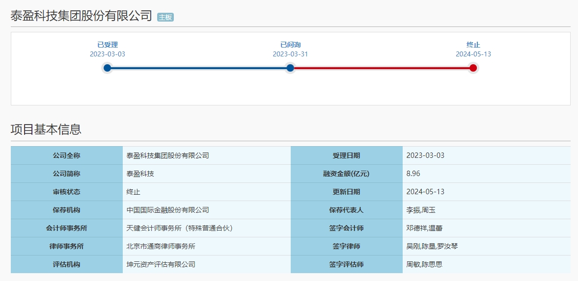 5月13日,上交所官网显示,泰盈科技集团股份有限公司(下称“泰盈科技”)及其保荐人撤回发行上市申请,根据有关规定,上交所决定终止其主板发行上市审核。
