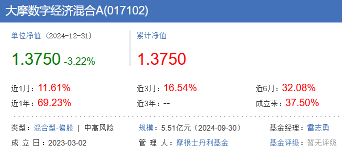 截至2024年12月31日,虽然大摩数字经济混合基金近1年的净值收益率为69.23%,但其成立以来的净值收益率仅为37.50%。