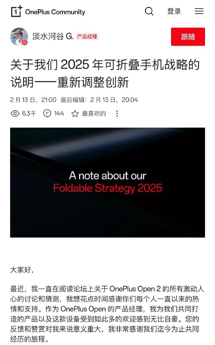 ▲一加产品经理在用户社区宣布暂停折叠屏手机发布
