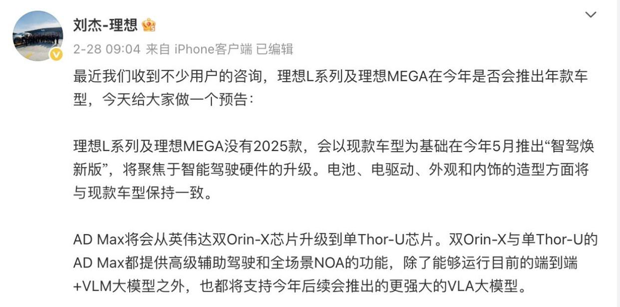 除了以展车形式清库,理想汽车副总裁刘杰今年2月在微博发布的关于新车信息,也被部分车主认为存在误导。刘杰称理想L系列及理想MEGA没有2025款,5月推出的“智驾焕新版”将在智能驾驶硬件升级,电池、电驱动、外观和内饰的造型方面与现款车型保持一致。然而,5月8日理想L系列智能焕新版正式上市后,却对辅助驾驶、智能座舱、底盘、外观等软硬件功能进行升级,如全系标配新一代ATL激光雷达,MAX版以上车型搭载英伟达Thor – U芯片,电池续航变大,双腔空气悬挂等。这让3月购车、期待新款变化不大的max车主们难以接受,他们认为如果当时知道这些升级信息,可能会选择等待新款。