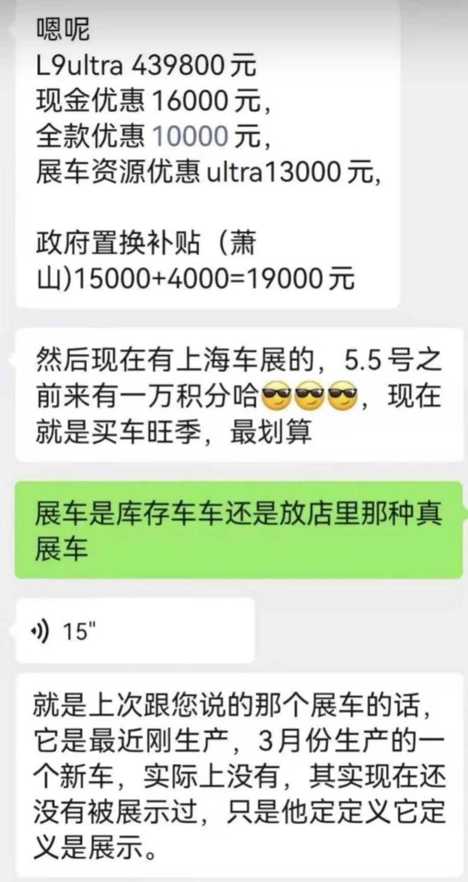 此外,理想汽车为规避保价协议,将新车当展车售卖的行为,更是让车主们怒不可遏。不少车主反映,3月购车时销售承诺不会遭遇“背刺”,然而4月理想汽车就为5月8日智能焕新版上市促销老款库存车,把新车当作展车卖并给予额外优惠。萧山车主表示销售人员称有“展车资源优惠ultra 13000元”,且明确是3月刚生产的新车;石家庄网友也证实销售人员称展车是全新车。这种变相优惠让刚订车和提车的车主们感到被欺骗,认为理想汽车故意用这种方式逃脱保价协议。
