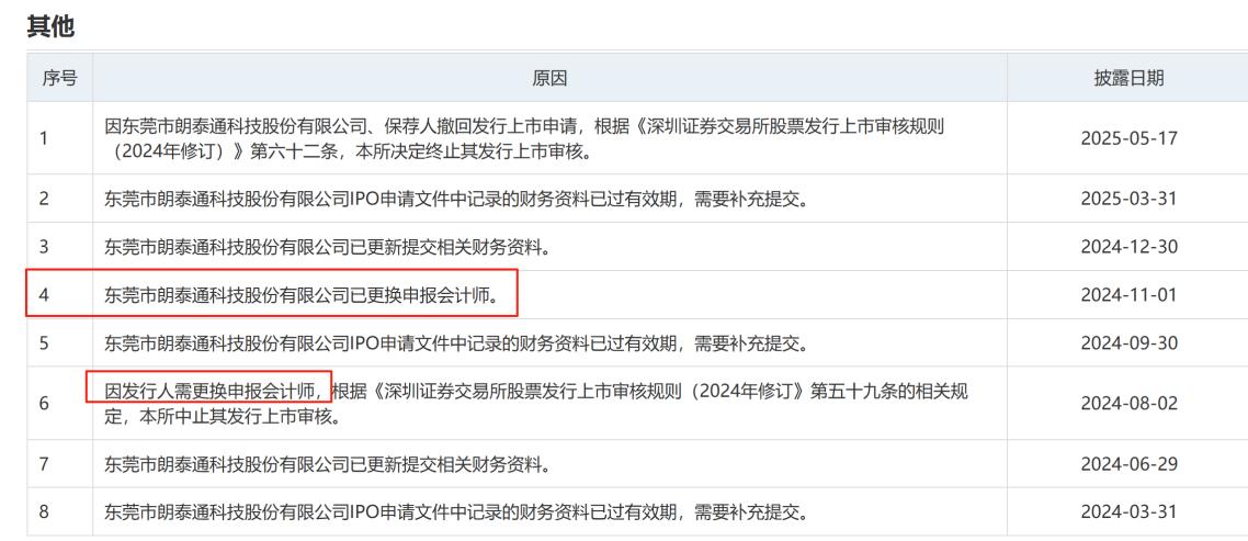 值得注意的是,朗泰通的上市审核曾因需更换申报会计师而被中止,但重新提交的财务资料却未对外披露。而当该公司再次因财务资料过期被“催更”后不久,需要补充的材料与IPO审核状态一起等来了终止的消息。